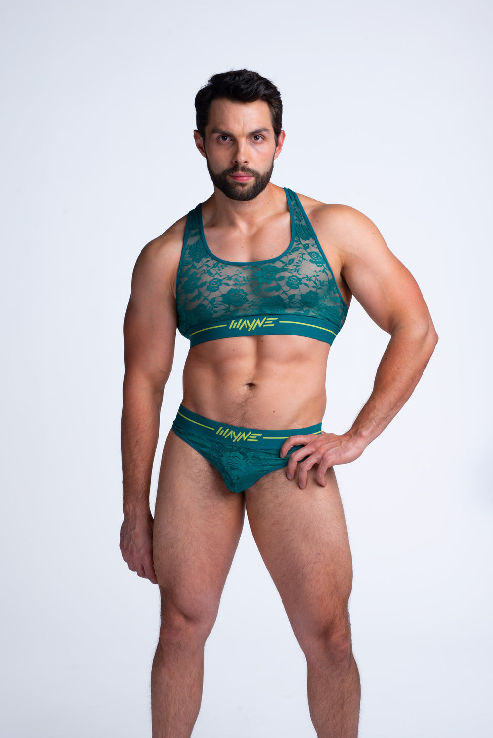 Make them feel lucky and sexy with the new Emerald Green Lace Set. Perfect fit for the guy who craves the naughty look and dare to attract attention. The minimal coverage on the back makes the butt pop tremendously, feels and looks like you're wearing nothing. Features a fitted lace harness top for a more sexier appeal. Ready, set, let's get sexy and lace up!